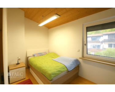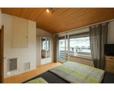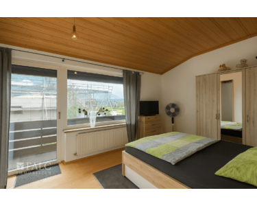 Im Obergeschoss befindet sich das ruhig gelegene Schlafzimmer, das als perfekter Rückzugsort dient. Von hier aus gelangen Sie direkt auf den überdachten Balkon, der einen schönen Ausblick ins Grüne bietet.