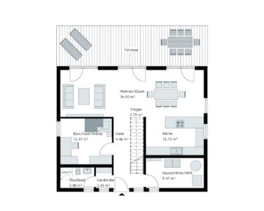 Die Grundrisse zeigen Beispiele und sollen Ihnen einen ersten Eindruck unserer Häuser bieten. Wie Ihr Haus später aussieht, entscheiden Sie selbst: vom Grundriss über die Ausstattung bis hin zur Frage, ob und welche Arbeiten Sie selbst übernehmen möchten.