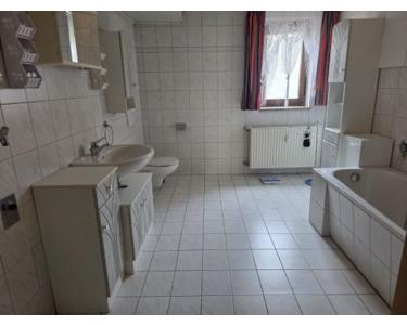 1. OG Obergeschoss: 96 m²: 5-Zimmer-Wohnung: Wohnzimmer (PVC), Flur (Fliesen), Bad mit Wanne, separater Dusche und WC (Fliesen), Flur (Fliesen), Schlafzimmer (Teppich), WC (Fliesen),