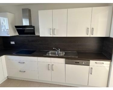 Einbauküche der Marke Nobilia mit allen Einbaugeräten wie Kühlschrank, Gefrierschrank, Geschirrspüler, Backofen, Mikrowelle, Induktionskoch-feld und Dunstabzugshaube.