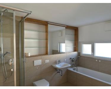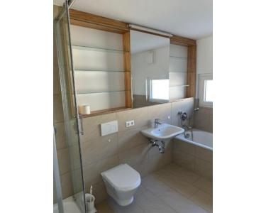 1 volle Badezimmer (mit Einbauspiegelschrank, Glas Wand Dusche, volle Badewanne, WC und Waschbecken)
