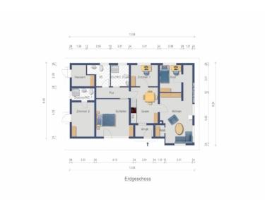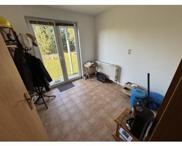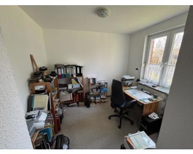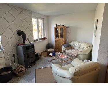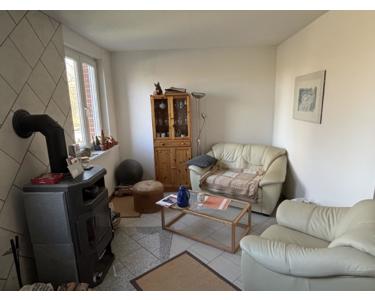 Die Wohnung im Erdgeschoss verfügt über eine Wohnküche, Wohnzimmer mit Kaminofen, zwei Schlafzimmer, Büro, WC und Duschbad.