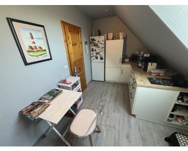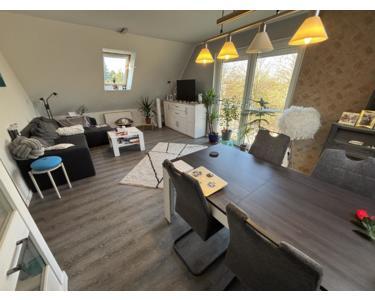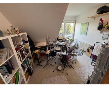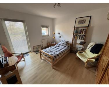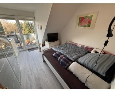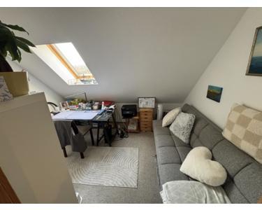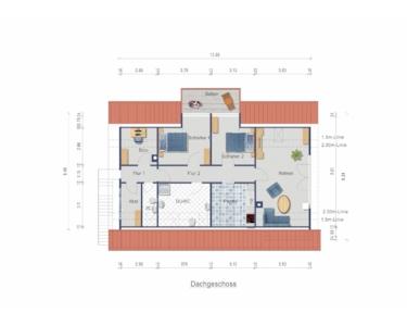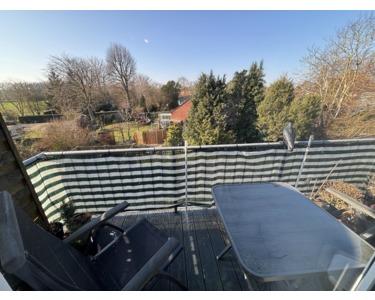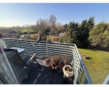 Die Dachgeschosswohnung verfügt über einen eigenen Balkon, von dem aus Sie den Blick ins Grüne genießen können. Auch hier sorgt eine kluge Raumaufteilung für Gemütlichkeit und Flexibilität. Großer Wohnbereich mit Kaminofen, 2 Schlafzimmer, Büro, Küche, Vollbad, Gäste-WC und Abstellraum.