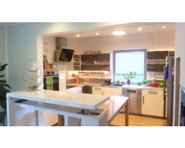 Erdgeschoss: Flur mit Gardrobe, Treppenaufgang, Offen gehaltener Flurbereich mit Kaminofen und Zugang zur windgeschützten, überdachten Terrasse, Essbereich/Küche mit Esstheke und Einbauküche, angeschlossener großer Vorratsraum, Wohnzimmer, Gäste-WC mit hochwertigem Washlet-WC , Büro-/Hauswirtschaftsraum, Wellnessbereich/Bad/WC mit Sauna, Dampfdusche und Badewanne.
