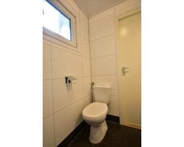 Das moderne Badezimmer bietet optimalen Komfort mit einer praktischen Bad-Dusch-Kombination, Waschbecken mit großem Spiegel und integrierter Toilette. Die weißen Fliesen und moderne Beleuchtung schaffen eine frische, saubere Ausstrahlung, während das Fenster für natürliches Licht und Belüftung sorgt. Die funktionale Aufteilung nutzt den verfügbaren Raum optimal. Das Badmöbel bietet Stauraum für Toilettenartikel. Dieses komplette Badezimmer erfüllt alle Bedürfnisse und erhöht den Komfort des Chalets erheblich während Ihres Aufenthalts im Bad Hoophuizen.