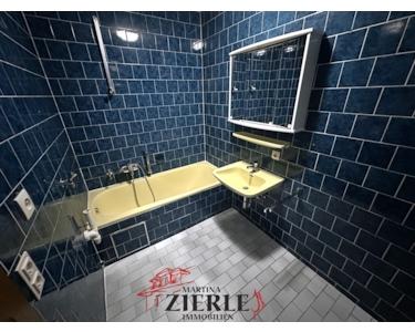 - Das Badezimmer ist raumhoch gefliest und mit einer Badewanne mit integrierter Dusche, einem Waschbecken und einem Waschmaschinenanschluss ausgestattet.