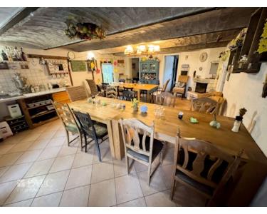 Ensemble: 2 vollständige Wohnhäuser + Einlieger-/Ferienwohnung, separates Gästezimmer, kleines Restaurant mit Profiküche, Werkstatt-/Holzschuppen, Teich, viele Terrassen/Grillplätze.