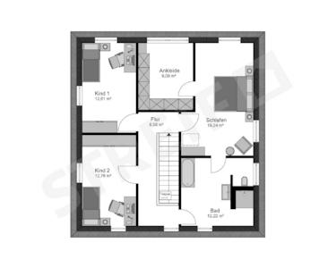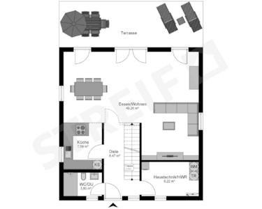 Die gezeigten Fotos und Grundrisse ist ein Hausbeispiel welches in der realen Umgebung abgebildet wird, und so umgesetzt werden kann. Jedes STREIF-Haus wird individuell nach Kundenwunsch geplant und gebaut.