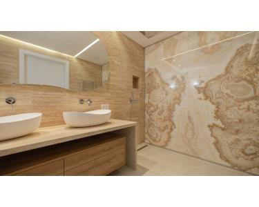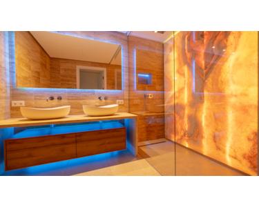 - Badezimmer mit Onyxplatten, Ambientebeleuchtung und Designerarmaturen
