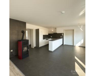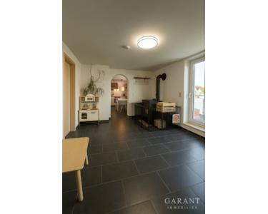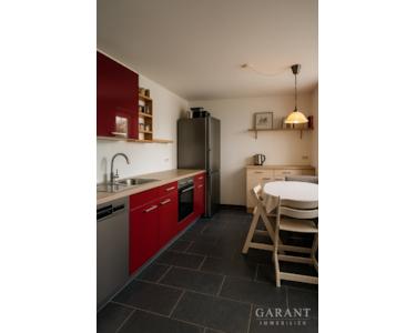 Im Erdgeschoss befindet sich eine helle, modern gestaltete Wohnung mit einer offenen Wohnküche, Theke, hochwertigen Einbauten und einem Holzofen. Das vollständig erneuerte Badezimmer verfügt über eine bodengleiche Dusche, eine Eckbadewanne, ein Doppelwaschbecken und ansprechende Fliesen. Durch die großen Fenster wirken die Räume freundlich und einladend. Zudem bieten die Nebenräume im Erdgeschoss weiteres Potenzial beispielsweise für ein zusätzliches Zimmer, ein Büro oder einen kleinen Wellnessbereich.