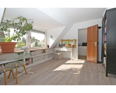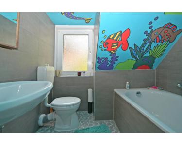 Im Obergeschoss gibt es ein großes Schlafzimmer mit Ankleide und ein Badezimmer mit Wanne.
