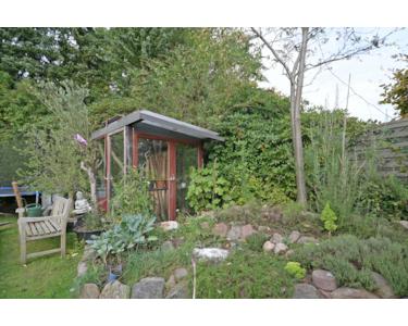 Der wunderschön eingefriedete Garten von über 500 m² bietet neben einer Doppelgarage noch ein schönes Gartenhaus und eine großzügige, überdachte Terrasse.