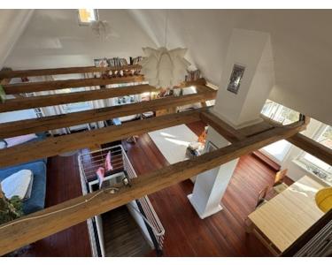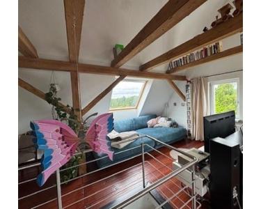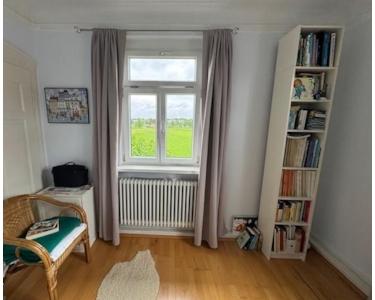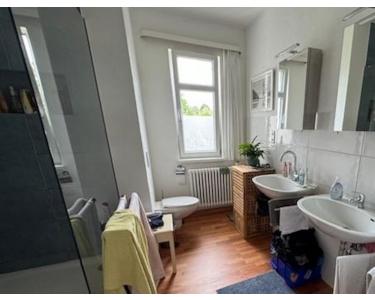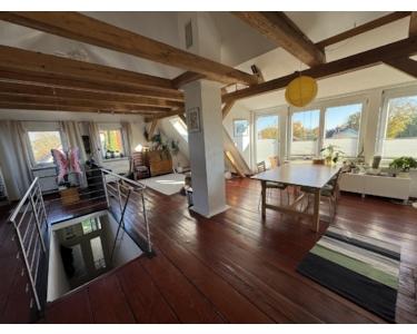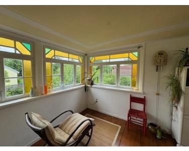 Das Haus besteht aus 2 in sich abgeschlossenen Wohnungen. Die Hauptwohnung erstreckt sich über das Obergeschoss und das Dachgeschoss und hat eine Wohnfläche von ca. 160 Quadratmetern. Die Wohnung hat 4 Schlaf- oder Arbeitszimmer, ein sehr großzügiges Wohnzimmer im Dachgeschoss, Küche, 2 Badezimmer, Gäste-WC sowie einen Wintergarten mit wunderbarer historischer Fensterverglasung.