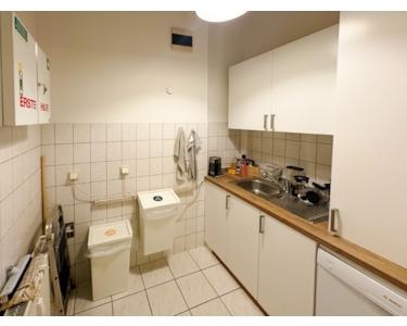 Die voll ausgestattete Teeküche bietet Raum für Pausen und Austausch; Kaffee, Tee und Hygieneartikel sind im Service enthalten.