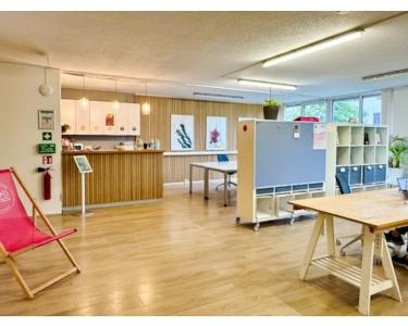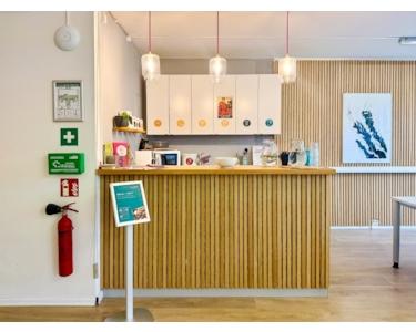 Die voll ausgestattete Gemeinschaftsküche mit großzügigem Aufenthaltsbereich lädt zum Netzwerken, Entspannen oder zu einer kurzen Kaffeepause ein – Kaffee, Tee und Hygieneartikel sind inklusive.