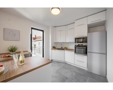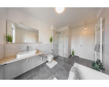 Die Ausstattung überzeugt mit klarer Gestaltung, hochwertigen Materialien und einem harmonischen Farbkonzept. Die moderne Einbauküche fügt sich nahtlos ein, während edles Echtholzparkett und eine Fußbodenheizung für stilvolle Behaglichkeit sorgen. Das tageslichthelle Bad ist mit eleganter Wanne und separater Dusche ausgestattet, ergänzt durch ein zusätzliches Gästebad mit Dusche – durchdacht bis ins Detail.