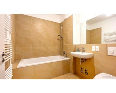 Ein Hauswirtschaftsraum mit Waschmaschinenanschluss, ein modernes Bad mit Wanne, Waschbecken und WC, sowie Fußbodenheizung, Aufzug und Kellerraum unterstreichen den hohen Wohnkomfort.