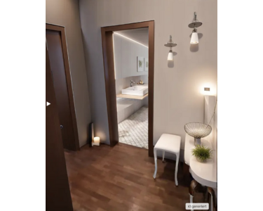Um Ihnen dennoch einen Eindruck vom möglichen Erscheinungsbild der Räumlichkeiten zu vermitteln, haben wir beispielhafte, von KI gestaltete Visualisierungen erstellt – lediglich als Inspiration gedacht.