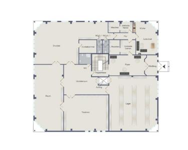 Ein ansprechender Eingangsbereich heißt Kunden und Mitarbeiter gleichermaßen willkommen. Diese Etage bietet vielseitig nutzbare Flächen für Produktion, Lager und Technik. Ergänzt wird das Raumangebot durch eine Küche, Sozialräume, Umkleiden und Sanitäranlagen. Ein Güteraufzug ermöglicht einen Zugang zu allen Ebenen und gewährleistet effiziente Abläufe im täglichen Betrieb.