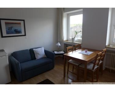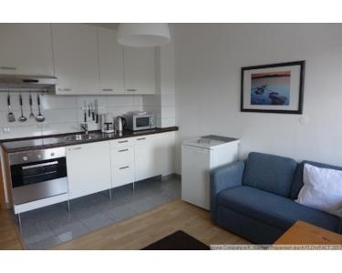 Von der Diele aus betritt man links den Wohnraum mit Sitzbereich, einer kleinen Essecke und dem gut ausgestatteten, integrierten Kochbereich.
