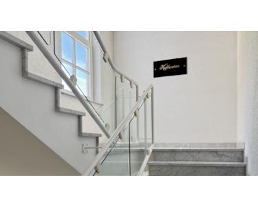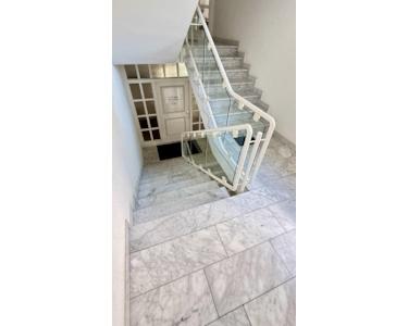 Das Treppenhaus ist komplett mit weißem Carrara Marmor ausgestattet und bietet ein repräsentatives Ambiente. Die Praxisräume haben eine Deckenhöhe von 2,7 m und große lichtdurchflutete Fenster. Dadurch wird der Raumeindruck positiv gesteigert. Die Fußbodenheizung bietet ein gutes Raumklima. Das Parkett und der Stuck runden diesen Eindruck ab.