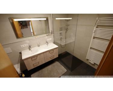 Doppelwaschbecken mit beleuchtetem Wandspiegel, Badevorleger, Waschmaschine, Wäschekorb, Handtücher