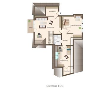Im 3. OG können 2 Zimmer, ein Bad sowie die Küche über einen Flur erreicht werden. Eines der Zimmer verfügt über einen Zugang zu einem der Balkone. Verbunden durch eine Treppe gelangt man über diese in die zweite Ebene im 4. Obergeschoss. Hier befinden sich jeweils 3 Zimmer, zwei Abstellräume und ein weiteres Bad, welche wieder durch einen separaten Flur erreicht werden können. Über eines der Zimmer gelangt man auf den zweiten Balkon.