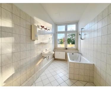 Das gepflegte Tageslichtbad ist klassisch gefliest und verfügt über eine Badewanne, ein Waschbecken und ein WC.