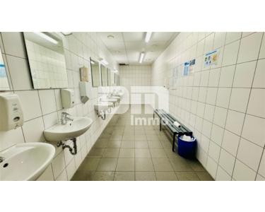 Das EG verfügt über einen Sozialtrakt mit zwei Umkleiden nebst Duschen und Waschräumen, HWR, Herren WCs (4x +4x Urinale), Frauen WCs (4x) sowie Technikraum und zwei abgeteilten Werkstattbereichen mit tragfähigem Dach.
