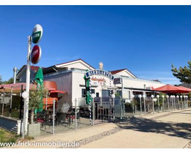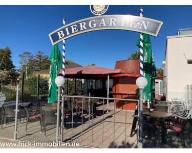 Biergarten (Faß) mit Außenplätzen und Besucher-WCs im Gebäude.