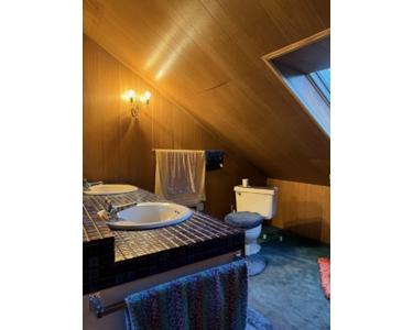 von der Wendeltreppe im Erdgeschoss gelangt man in den Flur des Dachgeschosses. Hier befindet sich links, ein großzügiges Kinderzimmer sowie ein daneben liegendes Bad mit WC.