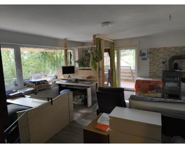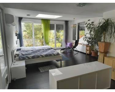 Oder man bewohnt selbst die 200 qm im EG/DG, mit dem Highlight der 2 x 4 m großen bodentiefen Fensterfronten in der 10 m langen Gaube im DG und dem 63 qm Raum im EG, der als Küche, Esszimmer, Wohnzimmer (mit Kaminofen) und Büro genutzt werden kann. Die Mieteinnahmen der restlichen drei 2-Zi-WE im UG und EG-Ostflügel können eine angenehme Einnahmequelle sein.