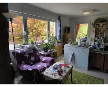 WE 3 - EG rechts: über die große Ost-Terrasse Eingang zur 2-Zi-Wohnung mit Küchenzeile, Bad mit Wanne, Platz für WM + Trockner, ca. 40 qm, vermietet.