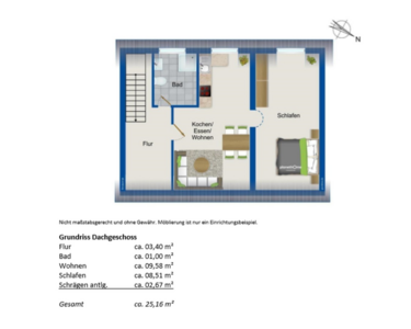 Dachgeschoss a 4 Betten: Flur, Bad, Wohnen, Schlafen, Schrägen antlg. = ca. 25,16 m²