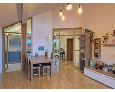 Ein echtes Highlight sind die teilweise überhohen Decken in den Wohnräumen, die sich bis zum Dachspitz öffnen und dem Zuhause ein außergewöhnliches Raumgefühl verleihen. Die nach Süden ausgerichtete Glasfront sorgt für viel Tageslicht und schafft in Kombination mit der offenen Raumgestaltung ein modernes, großzügiges Wohnambiente.