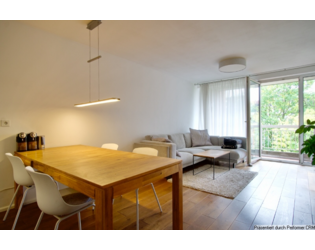 Die schicke offene Einbauküche enthält eine Spülmaschine, Kochfeld und Backofen, Mikrowelle, Koch- und Essgeschirr, es gibt einen schönen großen Holztisch mit 4 Stühlen. Im Wohnbereich steht eine große Couchlandschaft und ein großes Smart-TV-Gerät (AppleTV), von hier aus blickt man über einen überdachten Balkon ins Grüne.