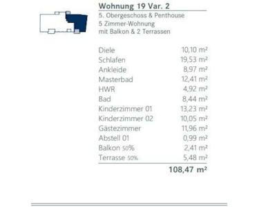 Die hier angebotene Wohneinheit verteilt sich auf 5 Räume, 2 Bäder, Gäste-WC, Abstellkammer, Hauswirtschaftsraum und Ankleidebereich sowie zwei Terrassen und einen Balkon, von denen aus zwei der Zimmer und der große Wohn/Essbereich im Dachgeschoss zu erreichen sind.