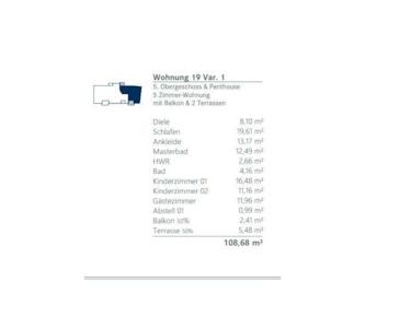 Die hier angebotene Wohneinheit verteilt sich auf 5 Räume, 2 Bäder, Gäste-WC, Abstellkammer, Hauswirtschaftsraum und Ankleidebereich sowie zwei Terrassen und einen Balkon, von denen aus zwei der Zimmer und der große Wohn/Essbereich im Dachgeschoss zu erreichen sind.