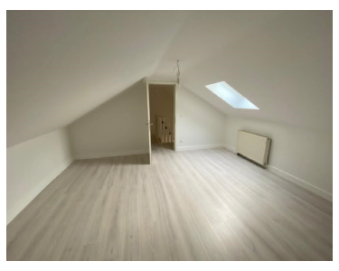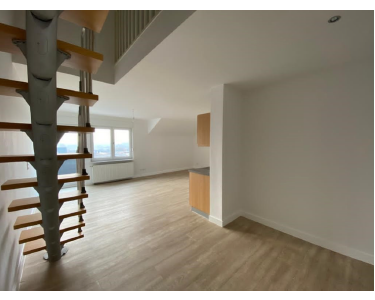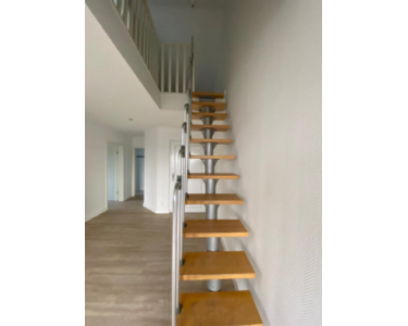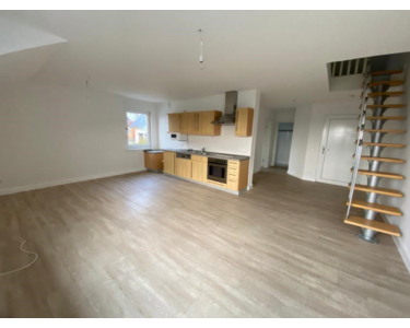 Im 1. Obergeschoss befinden sich ein offener Wohn- und Essbereich mit einer integrierten Einbauküche und Zugang zum Balkon, ein Schlafzimmer und ein hell gefliestes Bad. Der Dachspitz, der als Abstellraum genehmigt wurde, bietet ein weiteres Zimmer. Die Wohnung ist mit robustem PVC-Boden ausgestattet. Auch eine Einbauküche ist bereits vor Ort.