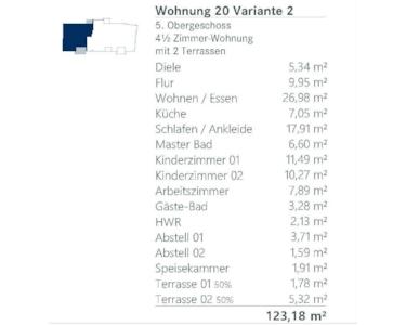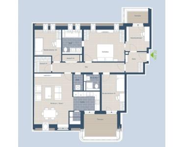 Die hier angebotene Wohneinheit, gelegen im 5. Obergeschoss, verteilt sich auf 4 1/2 Räume, zwei Badezimmer, zwei Abstellkammern, Hauswirtschaftsraum sowie zwei Terrassen, von denen aus ein Zimmer und der offene Wohn-/Essbereich zu erreichen sind.