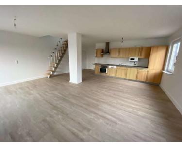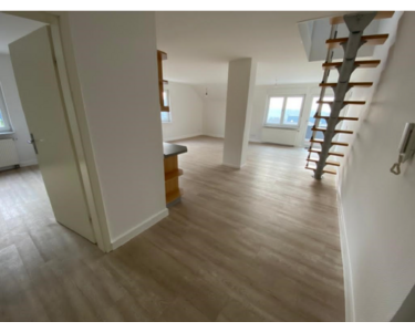 Im 1. Obergeschoss befinden sich ein offener Wohn- und Essbereich mit einer integrierten Einbauküche und Zugang zum Balkon, ein Schlafzimmer und ein hell gefliestes Bad. Der Dachspitz, der als Abstellraum genehmigt wurde, bietet ein weiteres Zimmer. Die Wohnung ist mit robustem PVC-Boden ausgestattet. Auch eine Einbauküche ist bereits vor Ort.