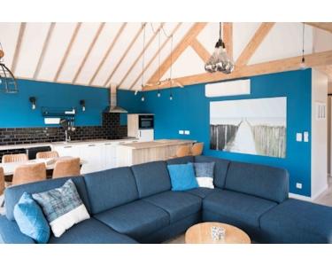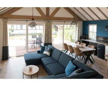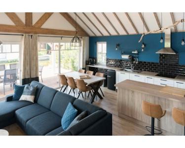 Das luxuriöse Wohnzimmer bildet das Herz dieses Wasser-Ferienhauses mit spektakulären Holzbalken, die für eine einzigartige, räumliche Ausstrahlung sorgen. Die auffällige blaue Akzentwand schafft eine moderne, stilvolle Atmosphäre, die perfekt zur Wasserlage passt. Das komfortable Ecksofa bietet reichlich Platz für Entspannung und Geselligkeit. Die großen Terrassentüren schaffen eine nahtlose Verbindung zur Terrasse und zum eigenen Steg, sodass Innen- und Außenbereich vollständig verschmelzen. Das natürliche Licht, das durch die großen Fenster hereinströmt, verstärkt die räumliche Ausstrahlung. Die moderne Beleuchtung und durchdachte Aufteilung machen dieses Wohnzimmer zum perfekten Ort, um den Wasserblick und die Ruhe des Ferienparks De Groote Vliet zu genießen.