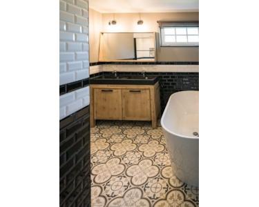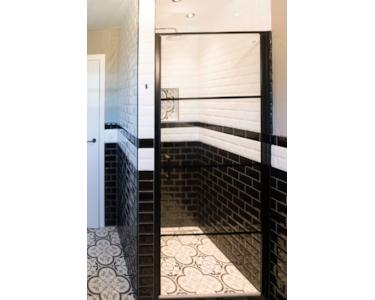 Das luxuriöse Badezimmer bietet optimalen Komfort mit stilvoller begehbarer Dusche mit schwarzen Profilen, Doppelwaschbecken und Holz-Badezimmermöbel. Die Kombination aus schwarz-weißen Metrofliesen und portugiesischen Bodenfliesen schafft eine einzigartige, luxuriöse Ausstrahlung. Der große Spiegel mit moderner Beleuchtung erhöht den Komfort. Die praktische Aufteilung sorgt für optimale Raumnutzung. Dieses komplette Badezimmer erfüllt alle Bedürfnisse und erhöht den Komfort des Wasserfront-Ferienhauses erheblich während Ihres Aufenthalts im Ferienpark De Groote Vliet.
