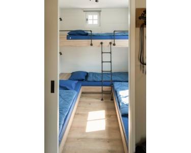 Das clevere Schlafzimmer mit vier Etagenbetten bietet optimale Flexibilität für Familien mit Kindern. Die weißen Holzwände schaffen eine frische, helle Atmosphäre. Die praktische Aufteilung maximiert die Raumnutzung innerhalb der 75m² Wohnfläche. Jeder Schlafplatz verfügt über eigene Lesebeleuchtung für zusätzlichen Komfort. Das Fenster sorgt für natürliches Licht und Belüftung. Dieses Schlafzimmer ist perfekt für Kinder, die zusammen schlafen können während des Urlaubs im Ferienpark De Groote Vliet an seiner einzigartigen Wasser lage.
