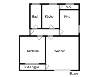 Die Wohnung wird über den mit Laminat ausgelegten Flur betreten. Von hier aus sind alle Zimmer erreichbar. Vom Wohnzimmer mit Teppichboden besteht Zugang zum sonnigen Süd-Loggia. Das Schlafzimmer mit großem Fenster ist sehr hell und ebenfalls mit Teppichboden ausgelegt. Das Kinderzimmer hat Laminatboden. Von der gefliesten Küche mit Einbauküche ist die ebenfalls geflieste Speis erreichbar. Das Bad mit Wanne, Waschbecken, WC ist deckenhoch hell gefliest und mit Wanne.