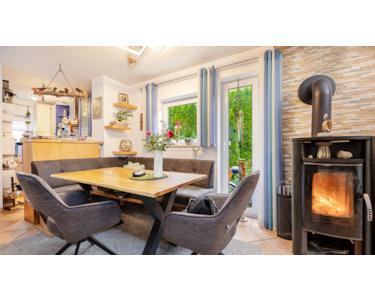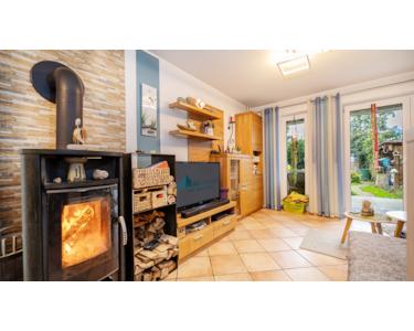 Im Erdgeschoss befindet sich der großzügige Wohn-, Ess- und Kochbereich mit ca. 35 Quadratmetern. Große Fensterflächen schaffen eine helle, freundliche Atmosphäre und lassen viel Tageslicht herein. Der offene Grundriss verbindet Kochen, Essen und Wohnen zu einem modernen, kommunikativen Mittelpunkt des Hauses. Ein stilvoller Holzofen sorgt für wohlige Wärme und Gemütlichkeit. Vom Wohnbereich aus gelangt man direkt auf die Terrasse und in den idyllisch angelegten Garten, der zum Entspannen und Verweilen einlädt.