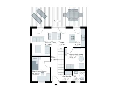 Der Angebotspreis versteht sich inkl. Grundstück (zzgl. Baunebenkosten) und bezieht sich auf die Standard-Ausbaustufe Fast-Fertig-Plus. Ihre Eigenleistungen: Spachtel-, Tapezier- und Malerarbeiten, Bodenbeläge, Innentüren.