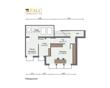 Über eine interne Treppe führt der Weg in das Kellergeschoss, das die Nutzfläche der Wohnung erheblich erweitert. Der Hobbyraum mit rund 15,6 m² lässt sich flexibel einsetzen und bietet sich insbesondere als Büro oder Gästezimmer an. Ergänzt wird diese Ebene durch Vorratsräume, eine Waschküche sowie zusätzliche Abstellflächen, die für Ordnung und praktischen Stauraum sorgen.