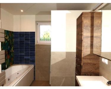 Die Renovierung und Modernisierung des Erd- und Obergeschosses wurde individuell und detailliert geplant sowie hochwertig ausgeführt. Die Hauseingangstür ist außen in Lärche und innen, wie auch alle Zimmer- sowie die Wohnungeingangstüren in querverlaufender Asteiche gefertigt. Sämtliche Fenster, Balkon- und Terrassentüren wurden dreifachverglast mit äußeren Lärchenholz- und inneren Fichtenholzrahmen gebaut.