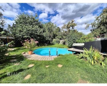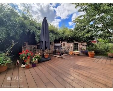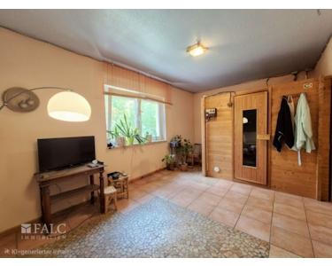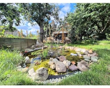 Ein besonderes Highlight ist der Zugang zur Terrasse, der einen wunderbaren Blick in den großen Garten bietet. Der Garten selbst ist ein Paradies für Naturliebhaber und lädt mit seinem Pool und einem kleinen Teich zum Entspannen ein. Ein Gartenhaus bietet zusätzlichen Stauraum oder kann als Hobbyraum genutzt werden.
